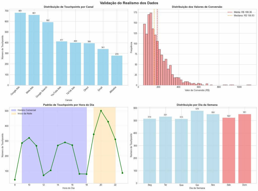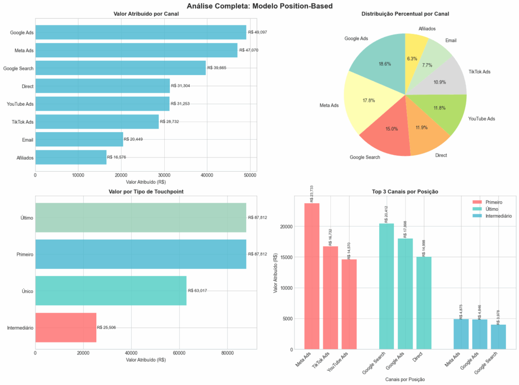 1. Dados realistas revelam o verdadeiro valor: Com dados que refletem investimento real por canal, padrões temporais e distribuições monetárias apropriadas, o Position-Based mostra resultados muito mais próximos da realidade do marketing digital;