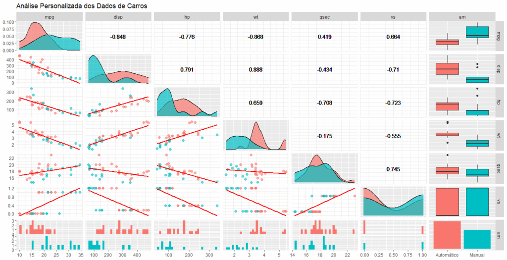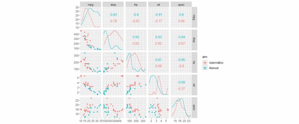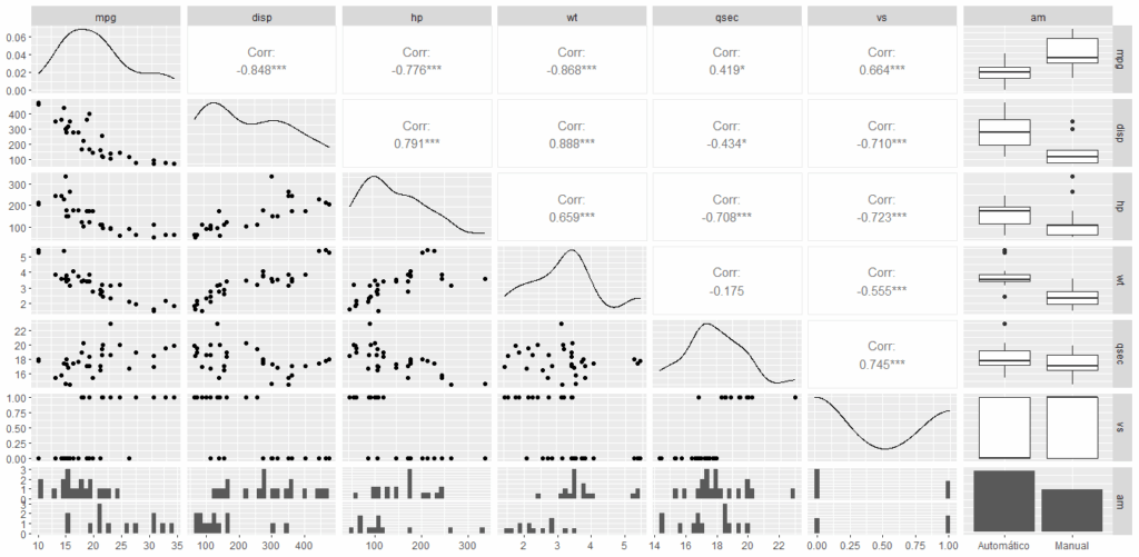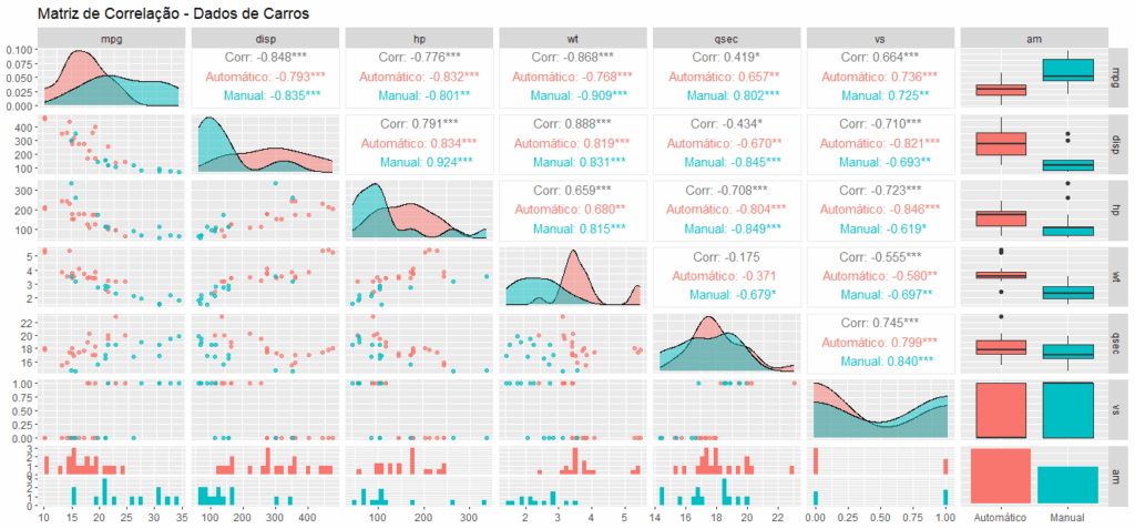 Para demonstrar as funcionalidades do GGally, utilizaremos o conjunto de dados mtcars, que contém informações sobre diferentes modelos de carros: